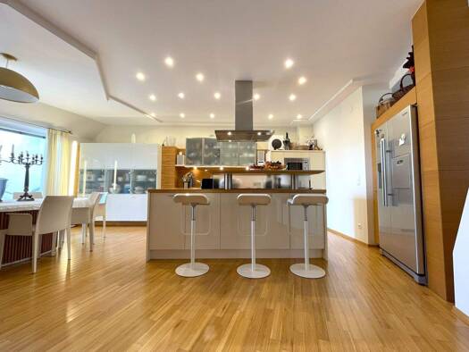 Exklusives Dachgeschoss: Auf 2 Ebenen mit anspruchsvoller Ausstattung Wohnsalon 60 m² Modern ausgestattete Küche, hochwertige Elektrogeräte mit Ausgang zur großen Terrasse Diese kann evtl. Als ...