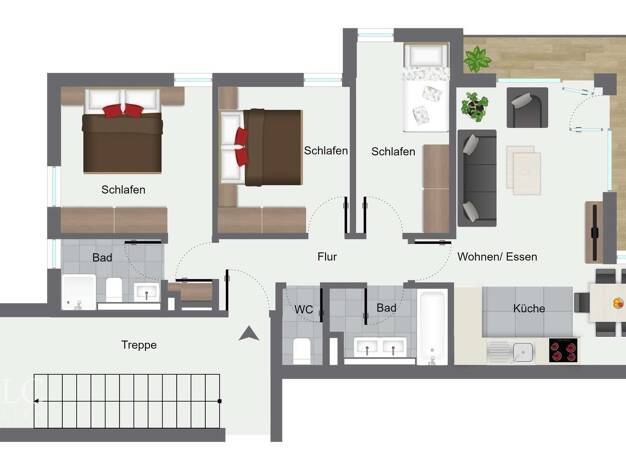 Die Wohnung Nr. 7 im Dachgeschoss hat eine Wohnfläche von 86,66 m² und verfügt über zwei Schlafzimmer, ein Bad/WC, ein Duschbad/WC, ein Wohnzimmer mit offener Küche sowie zwei Balkone (2,95 m² und 7,...