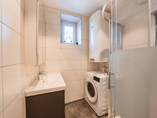 Die Wohnung wurde bei der Sanierung im Innenbereich umgestaltet. Anstelle eines Schlafzimmers wurde ein großzügiges Bad mit Dampfdusche sowie einer Badewanne errichtet. Ebenfalls wurde im Elternschla...