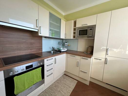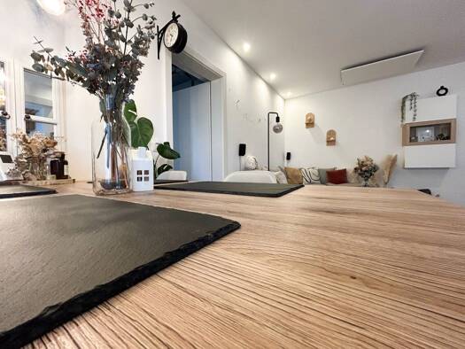 Willkommen in einer hellen Eckwohnung, die funktionale Planung mit wohnlicher Atmosphäre verbindet. Die moderne Küche in Weiß-Grau bietet Ceran-Kochfeld, Backofen und Geschirrspüler; die lange Arbeit...