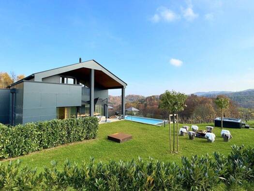 Diese moderne Traumimmobilie mit einer Grundfläche von ca. 1906m2 befindet sich am Eckberg in der Gemeinde Gamlitz in einer sehr ruhigen unverbaubaren, Aussichts- und Sackgassenlage. Fernab vom Trube...
