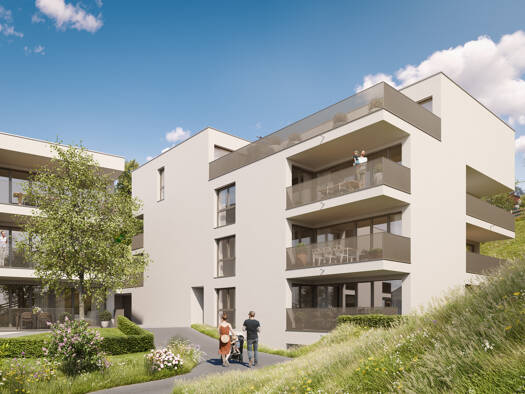 EIN NEUBAU ZUM WOHLFÜHLEN. Modernes Neubauprojekt Wohnbebauung in leichter Hanglage mit drei Baukörper, Gebäude Haus 1, Gebäude Haus 2 und Gebäude Haus 3, exklusive 2-, 3- und 4- Zimmer-Wohnungen, ge...