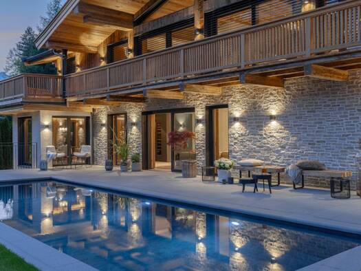Diese gerade fertig gestellte Luxusimmobilie im modernen, alpinen Stil bettet sich in eine der gefragtesten Lagen Kirchbergs. Altholz, Naturstein und viel Glas dominieren die attraktive Fassade und s...