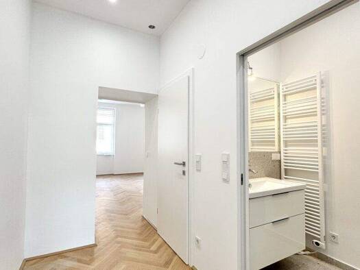 Die neu sanierte 1-Zimmer Altbauwohnung im 2. Obergeschoss (ohne Lift) überzeugt durch ihren zentral begehbaren Grundriss auf ca. 33,50m² Wohnfläche. Über den Vorraum gelangt man in den lichtdurchflu...