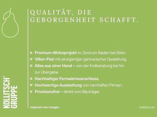 Genussvoll wohnen in Baden bei Wien. Die Seele baumeln lassen. In Stadtvillen inmitten von prächtigem Grün. Nur ein paar Schritte vom Rosarium entfernt. Am Eingang zur Altstadt. Wo sich Kultur und Na...