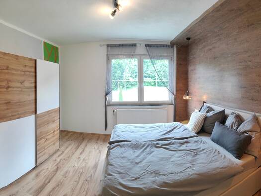 Durch jedes Fenster und auch vom Balkon gibt es einen Blick in den Garten und auf die angrenzenden Wälder. Für Ruhesuchende ideal 1. Stock mit Balkon und Sitzmöbel 1 Schlafzimmer mit Boxspringbett (2...