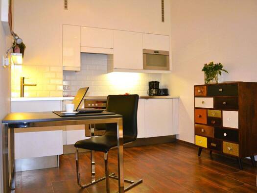 Full-Service Business Apartment mit einem fantastisch angenehmen Ambiente Wohlfühlbereich mit heimeliger Kolonial-Couch Voll ausgestattete moderne Küchenzeile mit hochwertigen Siemens Geräten Edler E...