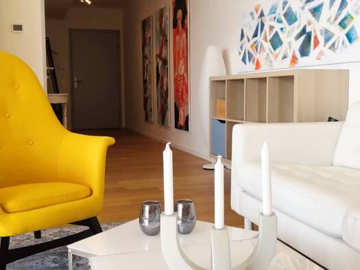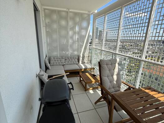 Das topmoderne Apartment lieg im 13. Stock eines vom Architekten Renzo Piano entworfenen Hochhauses. Special 1: Die Räume sind mit Originalgemälden einer bekannten österreichischen Malerin ausgestatt...