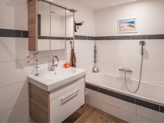 Eine Regendusche in Mitten von einem Blättermeer... fühlt sich fast an wie im Regenwald! Über ein paar Treppen geht es in das Bad dieses gemütlichen, kuscheligen Apartments. Schon der Waschtisch mit ...