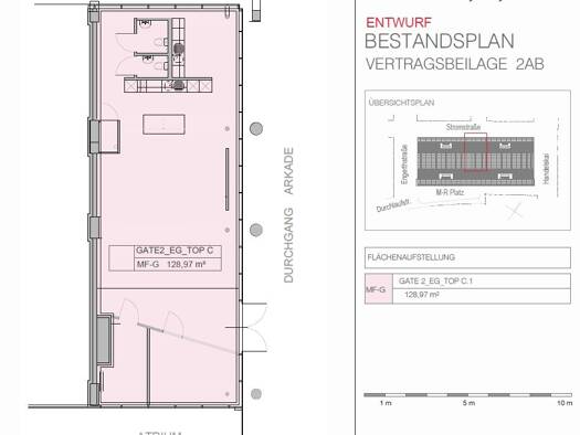Flächen- und KostenübersichtGeschoss: EG - Gate 2 Top: C Fläche: ca.129 m² Miete netto/m²: ab € 18,50 BK netto/m²: € 4,10 MF‐G = Mietfläche lt. GIF; Shop oder Schauraum, keine Gastrono...