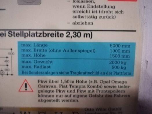 Stapelparker in einem Neubau Nähe Reumannplatz. max. LÄNGE: 5000 mm max. BREITE: 1900 mm (ohne Außenspiegel max. Höhe: 1500 mm max. BELASTUNG: 2000 kg max. RADLAST: 500kg