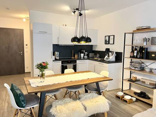 Diese moderne 2-Zimmer-Wohnung besticht durch einen hellen und offenen Wohn- Essbereich, einen pflegeleichten modernen Vinyl-Boden und einer hochwertig geschreinerten Küche. Der direkt an das Wohnzim...