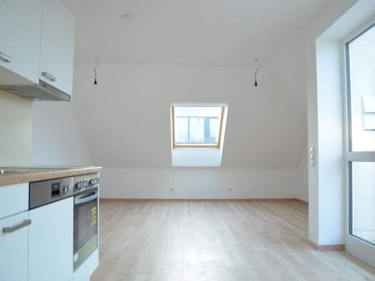 Aussergewöhnliche Dachgeschoßwohung mit Blick auf die Enns. Eine Küche ist möbliert. Im Bad mit Dusche und WC haben wir eine Fußbodenheizung. Direkt am Fluss Enns haben wir eine allgemeine Grünfläche...