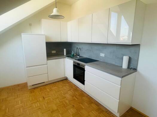 Die schicke Dachgeschosswohnung teilt sich wie folgt auf: 1 Vorzimmer 1 Wohnzimmer mit hochwertiger Küche 1 Schlafzimmer 1 Bad mit Wanne 1 Toilette 1 Abstellraum