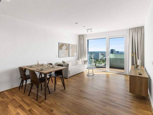 Diese exklusive, voll ausgestattete Wohnung im 29. Obergeschoss vereint stilvolles Wohnen mit atemberaubendem Panorama über die Dächer Wiens. Schon beim Betreten spürt man die hochwertige Verarbeitun...