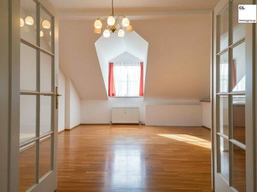 Die Wohnung erstreckt sich vom 1. Stock in das Dachgeschoß der Wohnanlage. Auf der ersten Ebene befinden sich das Wohnzimmer, die Ess-Küche, die Loggia, ein sonniger Balkon mit schönem Ausblick, dazu...
