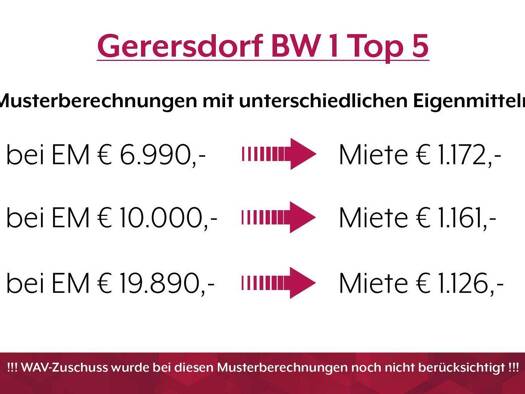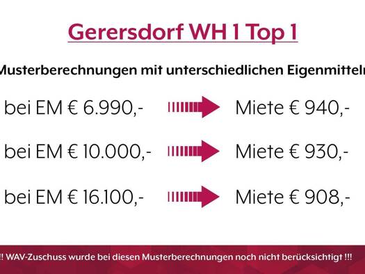 Kurzbeschreibung WAV | Gerersdorf | WH 1 | Top 1 Objekt *Die regulären Eigenmittel für diese Wohneinheit betragen aktuell 16.100,-. Eine Reduktion auf mindestens 6.990,- ist auf Wunsch möglich. Natür...