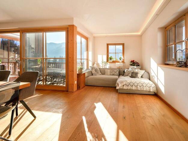 Die Obergeschosswohnung liegt in einem charmanten, 2016 neu errichteten Bauernhaus, in sonniger Lage, umgeben von landwirtschaftlichen Flächen und eingebettet in die malerische Bergkulisse der Bichla...
