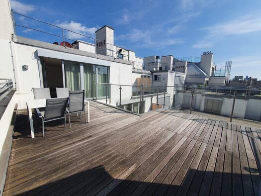 Zur befristeten Vermietung gelangt eine helle moderne Dachterrassenmaisonette - Nähe Schottenring/Donaukanal. Das Gebäude wurde 1870 im Stil der Wiener Neorenaissance errichtet und 2022 generals...