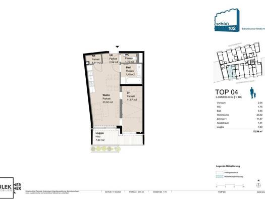 Die Wohnung hat ca. 56 m², befindet sich im 1. Stock eines neuen Gebäudes mit Aufzug und besteht aus einem zentralen Vorzimmer, einem Abstellraum, einer Einbauküche mit Geräten, einem Badezimmer mit ...